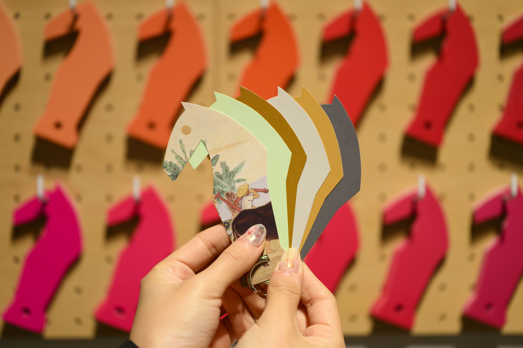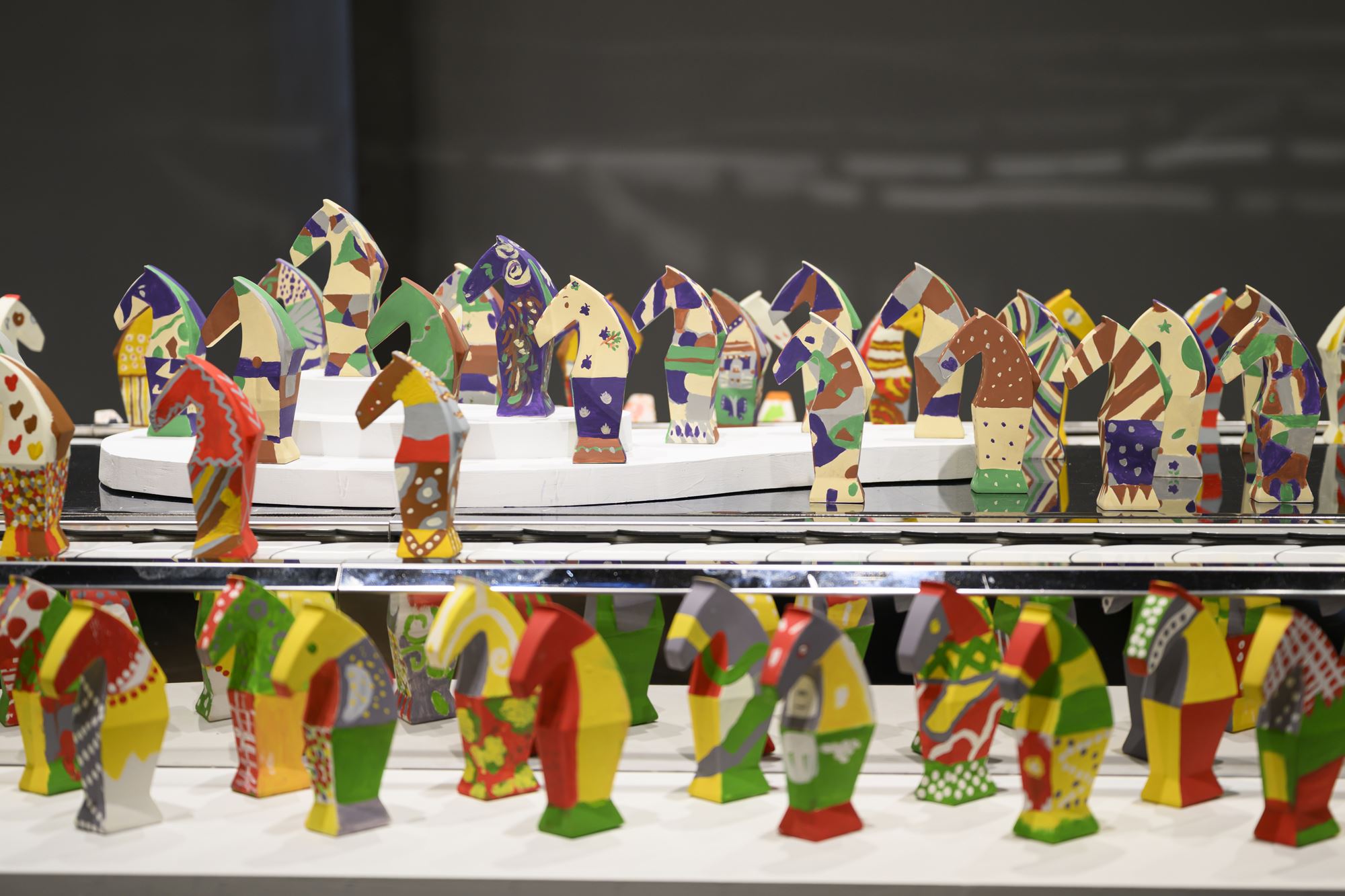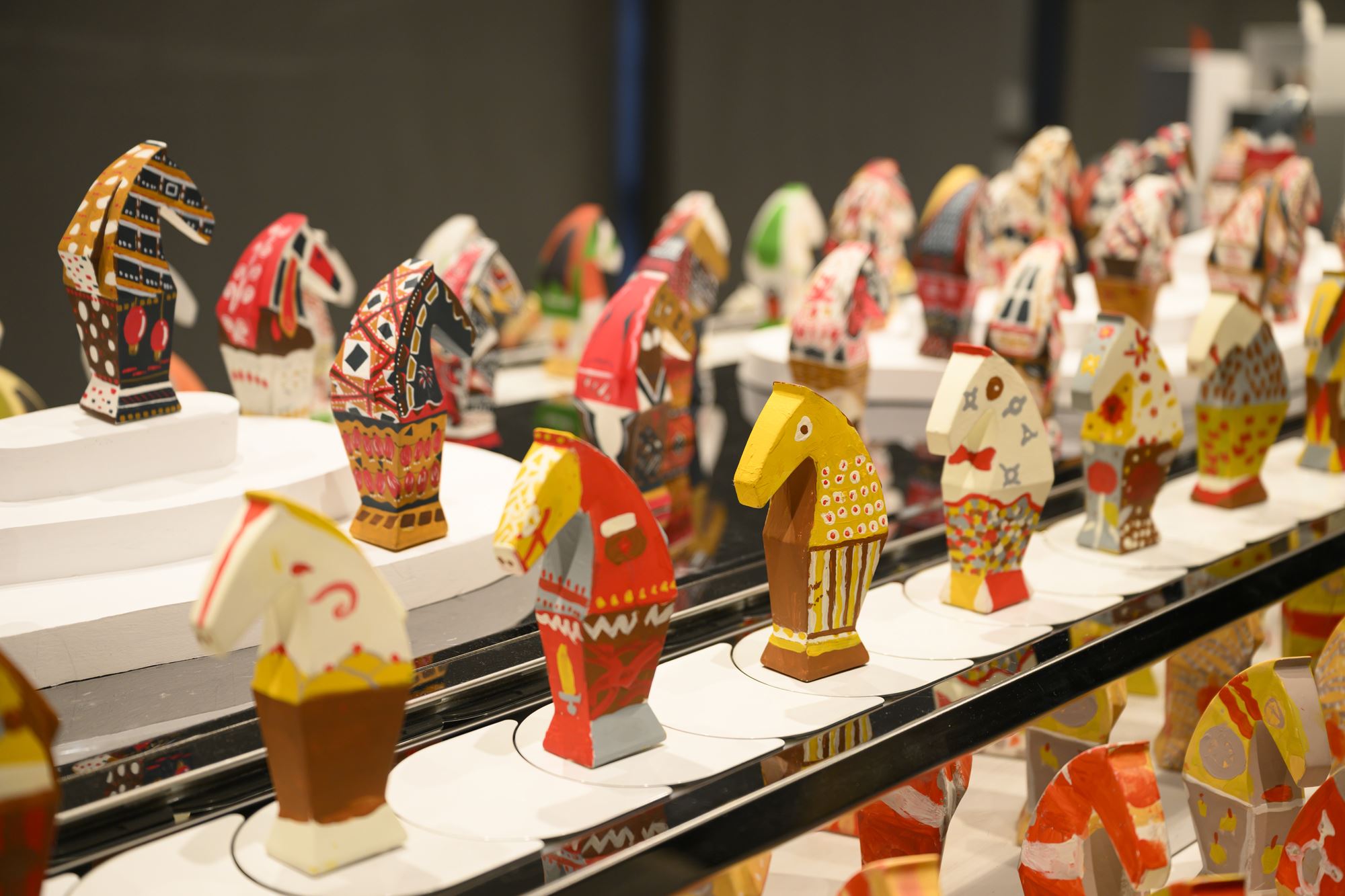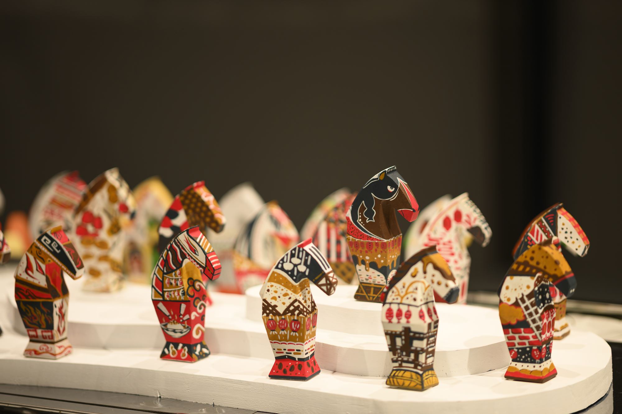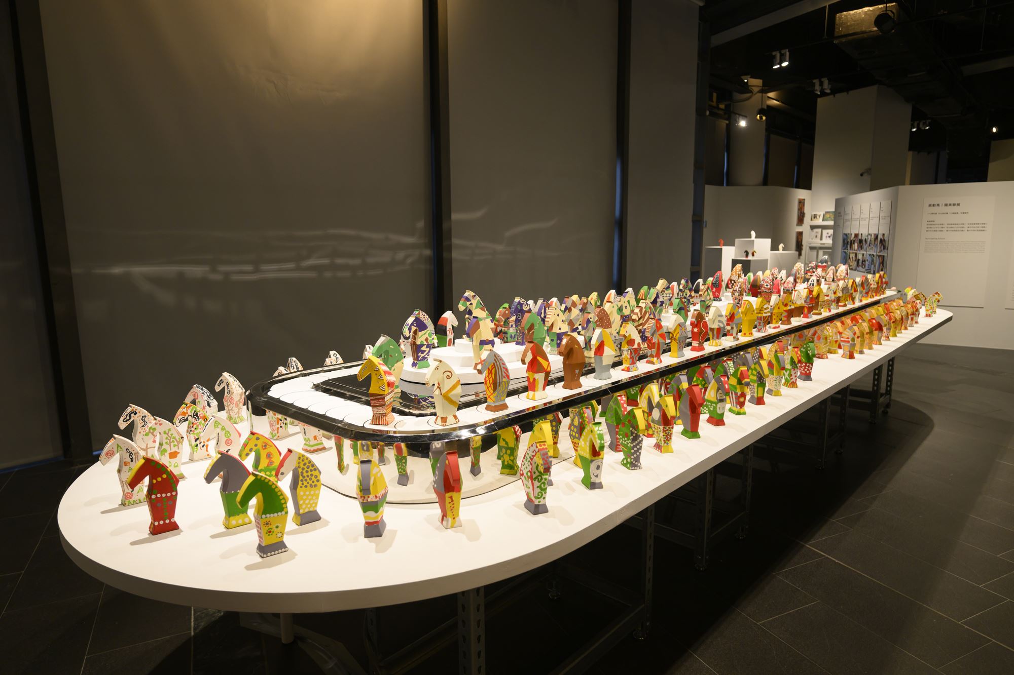 2026時序馬年,本展邀請莊普創作「感動馬」造型,作為彩繪創作素坯,以西洋棋中的馬為造型靈感,結合直線與弧線構成多角立面,勾勒昂首的馬頭與動感鬃毛,並以梯形柱體塑造馬身與馬蹄,展現穩定、韌性與蓄勢待發的力量感。本次特別邀請藝術家謝牧岐、徐婷、楊子興,以參展學校師生找尋的家鄉文化色彩,進行「小感動馬」彩繪創作,謝牧歧〈2馬,3馬〉以各異其趣的兩隻馬,象徵人們在新的一年可以保有自我樣貌,持續往前發展。楊子興〈馬上幸福〉則以臺南家鄉的烏魚子代表新年團圓的人情味,透過印花圖騰傳遞幸福之情。徐婷〈光落在途中〉以幾何色塊錯位隱喻不同時空的記憶,以及光的流動感。