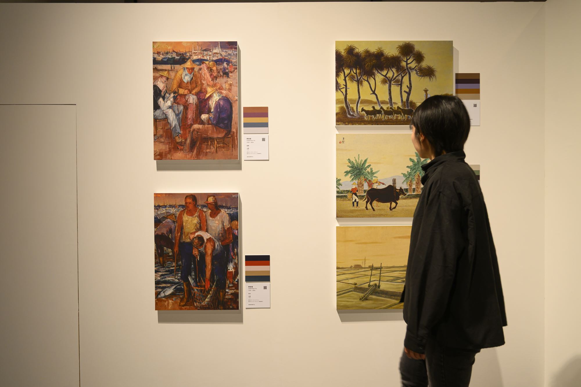 國美館表示,在當代數位生活中,社群媒體與影像編輯技術深刻地影響大眾對色彩的感受。濾鏡透過柔焦光暈、懷舊顆粒或高對比等效果,形塑出趨於同質的視覺風格,正如法國著名的色彩地理學家讓•菲力普•郎科羅(Jean-Philippe Lenclos)所指出,現代化進程中對形式一致性的追求,逐步削弱建築與環境色彩所蘊含的地方差異。本展從國美館典藏林之助、林惺嶽、黃水文、陳瑞福、蔡草如、賴傳鑑共十件作品中,梳理其對「自然」與「人文」兩大主題的色彩詮釋脈絡。例如林惺嶽在峻峭山勢與水流動勢之間,形構出關於地貌時間與歷史感的隱喻;蔡草如則以暖色調統攝畫面,在色彩的整體節奏中,細膩呈現光線變化與環境氛圍。此外,有鑑於AI生成技術已被廣泛使用,本次亦特別展出黃水文之子黃健次,將家族珍藏之黑白圖片及明信片以AI協作進行色彩化的數位作品,並邀請跨領域AI視覺藝術家James Maze以黃水文〈向日葵〉為靈感創作〈Memories of The Sunflower〉影像作品作為對應,探索AI生成技術運用於藝術作品之色彩意象的實驗性想像。