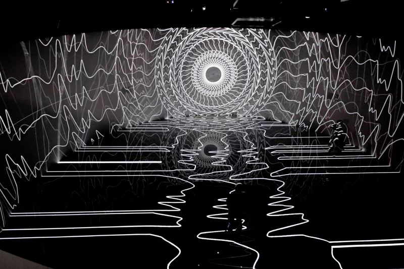 首發由美國藝術家Synthestruct的作品《VAST》(2022年版本),透過具催眠作用的幾何圖形與起伏聲場空間,帶領觀眾踏上一場聲音與視覺渾然融合的旅程。接續日本藝術家田所淳作品《和諧複變》(2022年版本),嘗試透過聲音和影像傳達緊張和放鬆,回應當下社會的現況。最後為臺灣新媒體藝術家許巽翔以及材料工程師黃胤豪組成的NANONANO壓軸登場,作品《(in)visible》就像是一場探索世界中各種微小訊號的遊記,轉譯了電子顯微鏡成像中的電子訊號,結合真實和虛擬的沉浸場景,創造實際存在卻又虛幻的未來意象。
