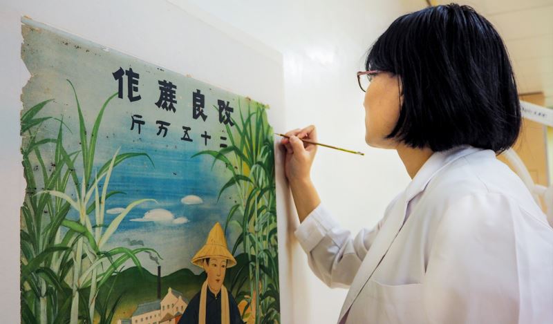 在需要長時間投入時間與心力的修復過程中,修復師循序漸進地移除了作品上下緣的鐵製吊桿,將破碎細微的紙張拼回作品原位,先暫時強固作品邊緣之後開始清除作品表面髒污,仔細移除紙張殘膠、攤平折痕,再進行海報基底材紙張的除酸處理以及局部漂白清洗,不但可淡化作品的褐斑,更利於日後的紙張保存。而為了延緩紙張纖維的脆化破損,也利用命紙來增加基底紙材的強度,透過乾燥繃平使作品定型。最後的步驟則是在缺損處補紙上全色來還原作品的原貌,完成了這幅林玉山先生的〈改良蔗作〉海報修復。